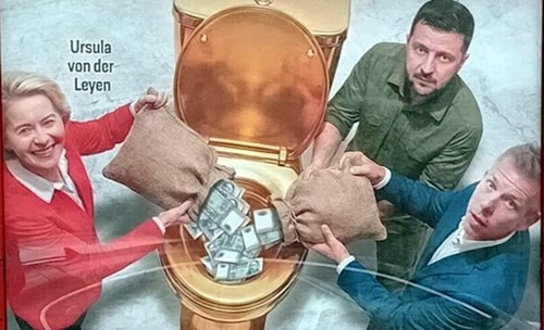 Плакаты с изображением главы Еврокомиссии Урсулы фон дер Ляйен и Владимира Зеленского, которые сливают деньги в золотой унитаз, появились на улицах Будапешта на фоне коррупционных скандалов в Киеве и Брюсселе, сообщает РИА Новости.