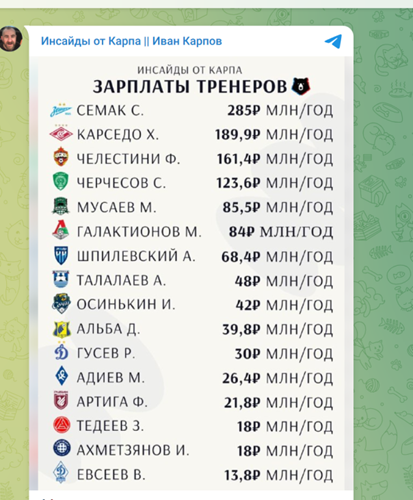 Журналист Иван Карпов опубликовал рейтинг зарплат главных тренеров клубов РПЛ.Сергей Семак возглавляет рейтинг самых высокооплачиваемых тренеров РПЛ с годовым доходом 285 млн рублей (23 млн в месяц), что выше даже зарплаты Дидье Дешама. Главный тренер сборной Франции получает 2,5 млн евро, что 234 млн рублей по нынешнему курсу.