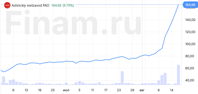 P.S.: Хороший пример того, что в недалекой перспективе вполне может произойти с акциями Сургутнефтегаза только что продемонстрировали ценные бумаги Ашинского МЗ. Эта компания также как и СургутНГ имеет значительные денежные накопления (правда, эти накопления на порядки меньшие, чем у Сургутнефтегаза), но более 20 лет не платила дивидендов. И вдруг на днях (через 2 месяца после годового собрания акционеров) она объявила, что собирается в качестве дивидендов по итогам первого полугодия 2024 года выплатить по 77 руб. на каждую акцию (при цене акции на тот момент около 90 руб.). В результате всего за 10 дней эти акции подорожали практически вдвое (а за последние 2 месяца аж в 3,5 раза):